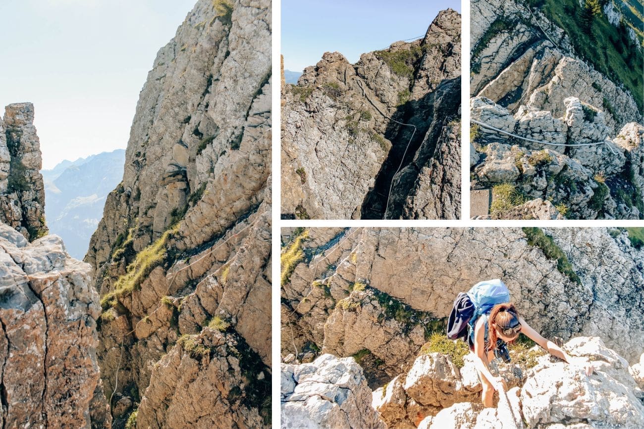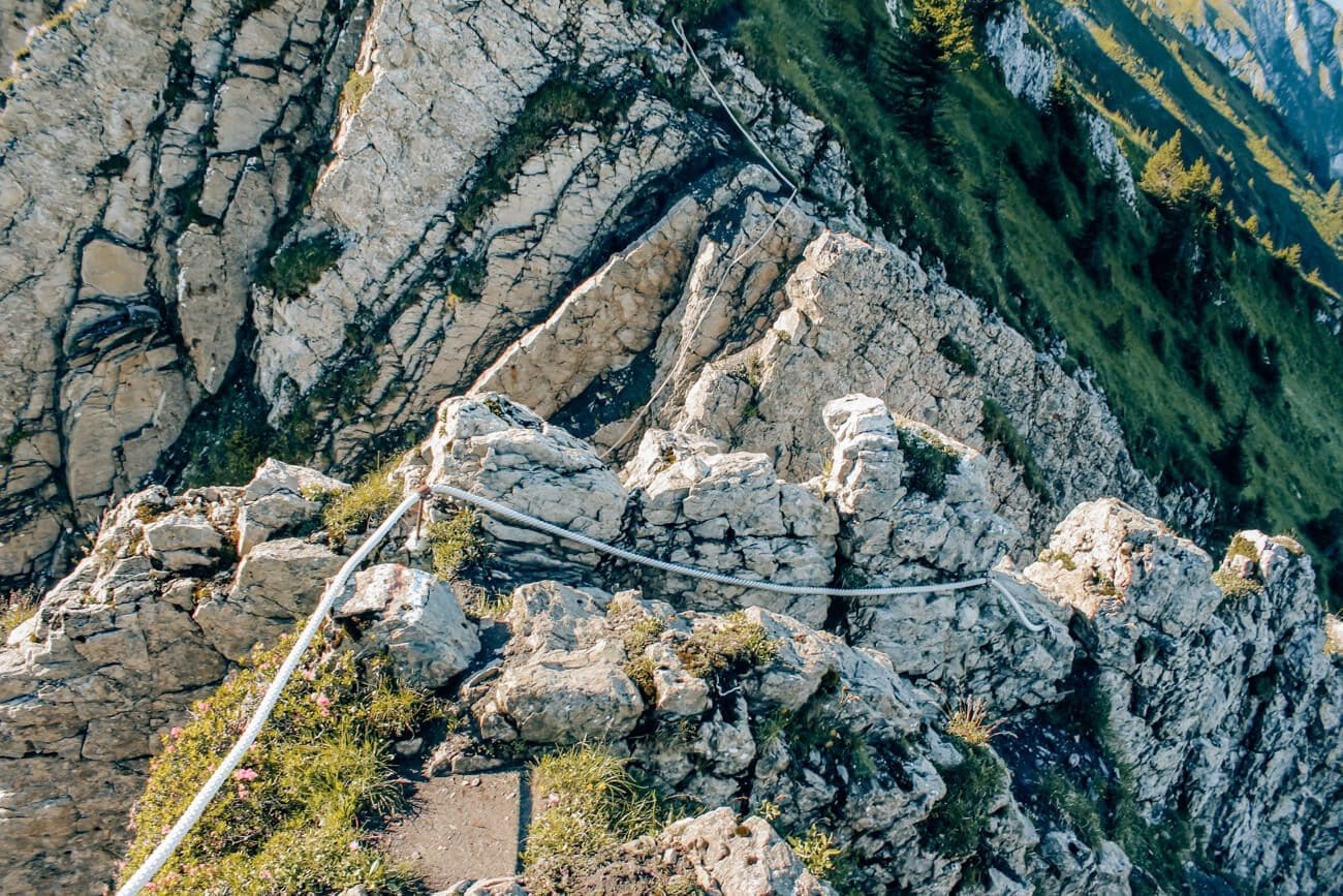 Aber meine Kamera muss jetzt erst einmal eingepackt werden. Denn vor uns liegt nun die Schlüsselstelle und wer auf Etappe 5 des Tell-Trails wandert muss die Felspassage Wagenleis überqueren. Die Stelle hat mich schon die letzten Tage immer wieder etwas beschäftigt, da ich nicht wusste, was auf mich zukommt. Die Querung ist inzwischen mit dicken Seilen zum Festhalten und einigen Eisentritten abgesichert. Dennoch ist hier Konzentration, Trittsicherheit und Schwindelfreiheit gefordert.